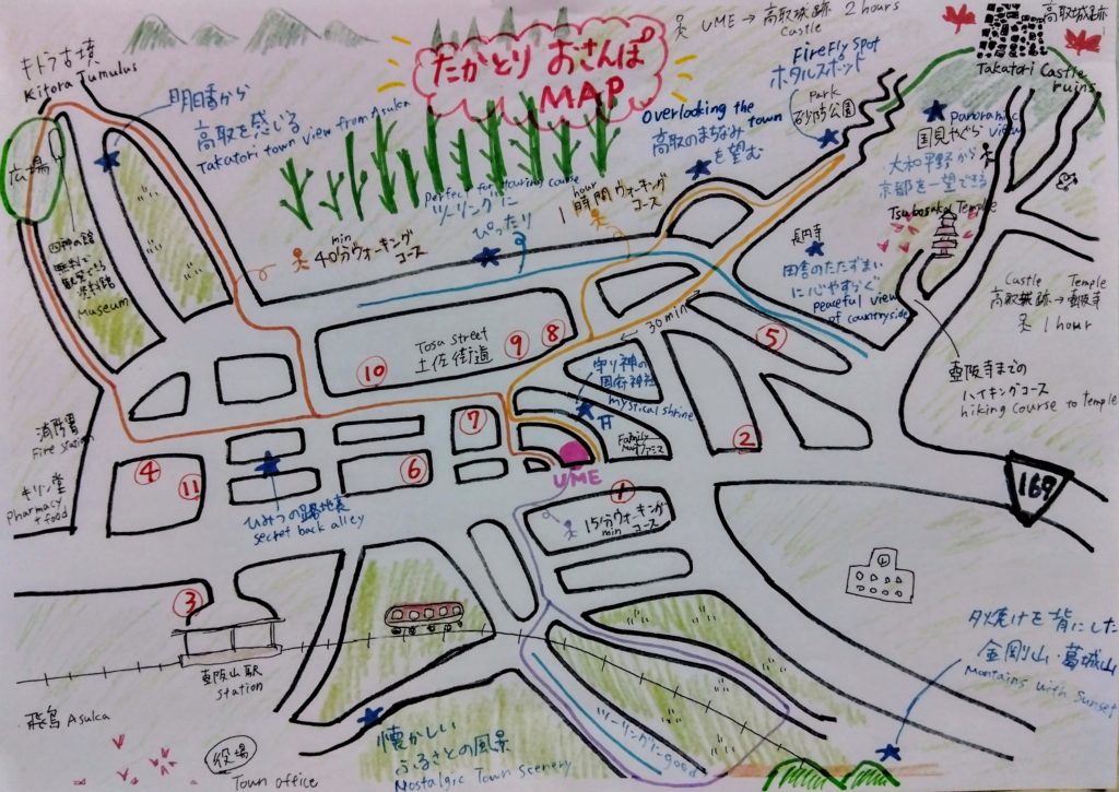 まちのこと 《 名所 》 高取城跡 壷阪寺 土佐街道 高取町観光ガイドHPで各名所や見どころについて詳しくまとめられていますので是非ご覧ください。 ボランティアガイドさんによる町案内もおすすめです! 《 UME周辺マップ と 食事処 》